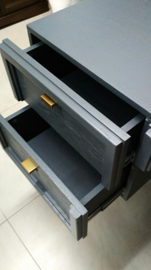 Каркасы изготовлены из ДСтП 26 мм, облицованного шпоном дуба. Фасадные поверхности изготовленные из ДСтП 16 мм., облицованного шпоном дуба и вставками из массива дуба. Стенки задние изготовлены из ДВП облицованого шпоном дуба. На ящиках установлены направляющие Hettich Innotech. Фурнитура - петли с доводчиком фирмы «Boyard». Стекло - витражное с фацетом |